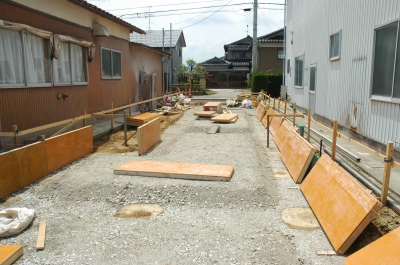 地盤の柱状改良を行い、掘削開始です。