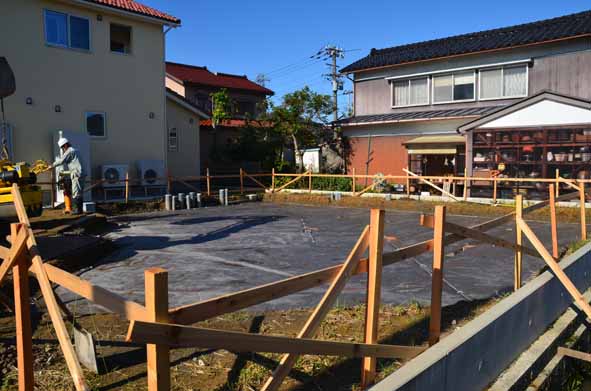 ジオクロスという特殊なシートで地面の耐力をつくり、建物の荷重を受け止めます。