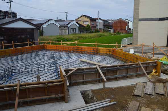 鉄筋の組み立て、外周部の型枠へと進んでいます。